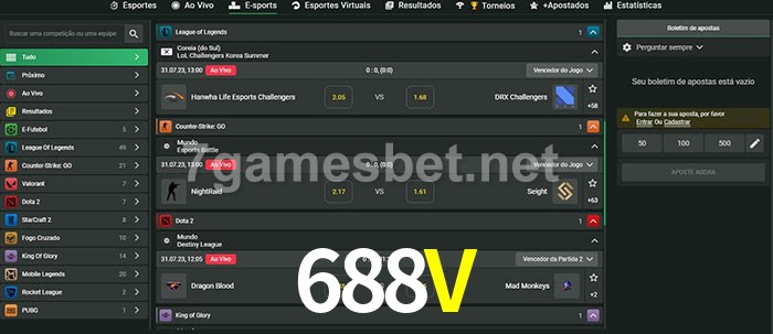 O 688V oferece uma grande seleção de opções de apostas em e-sports com probabilidades competitivas